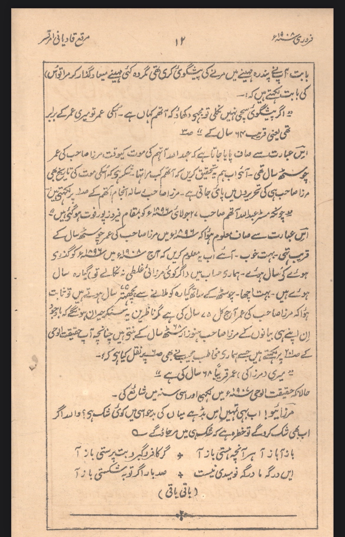 In the February 1908 edition of his magazine Murqa’ Qadiani, he acknowledges that Mirza Ghulam Ahmad (AS) had reached the age of 75, thereby fulfilling the prophecy: