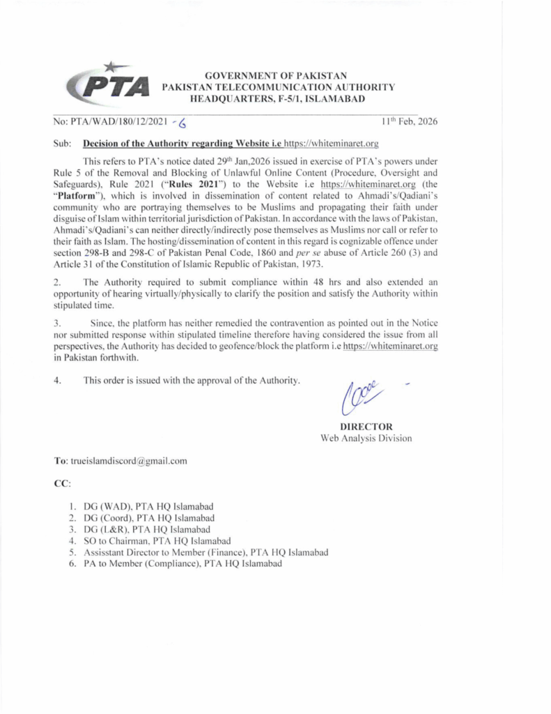Pakistani Government banned Ahmadi Muslim website: WhiteMinaret.org