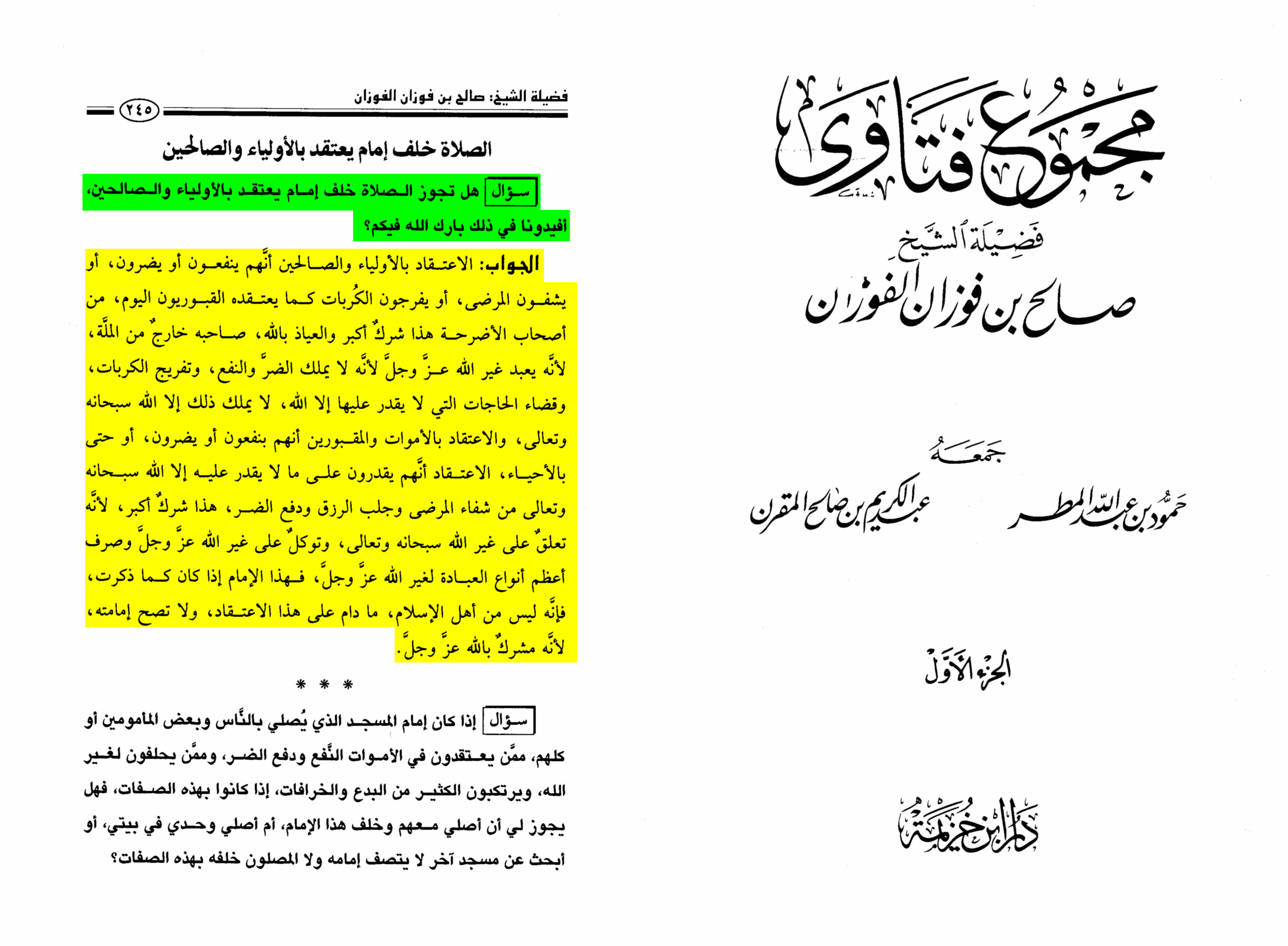 [Majmūʿ Fatāwā Faḍīlat al-Shaykh Ṣāliḥ bin Fawzān, vol 1, pg. 245]