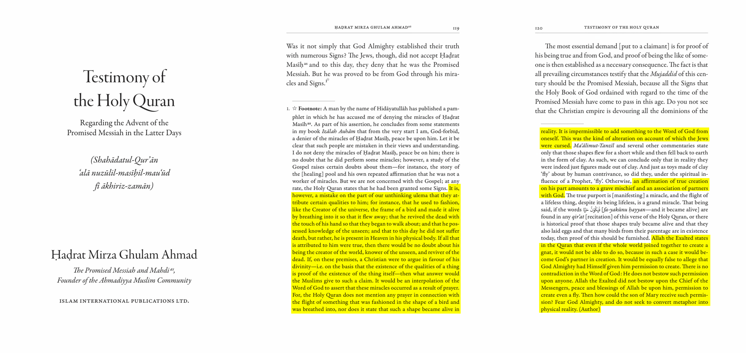 It would be an interpolation of the Word of God to assert that these miracles occurred as a result of prayer. For, the Holy Quran does not mention any prayer in connection with the flight of something that was fashioned in the shape of a bird and was breathed into, nor does it state that such a shape became alive in reality. It is impermissible to add something to the Word of God from oneself. This was the kind of alteration on account of which the Jews were cursed. […] an affirmation of true creation on his part amounts to a grave mischief and an association of partners with God. […] Allah the Exalted states in the Quran that even if the whole world joined together to create a gnat, it would not be able to do so, because in such a case it would become God’s partner in creation. It would be equally false to allege that God Almighty had Himself given him permission to create. There is no contradiction in the Word of God: He does not bestow such permission upon anyone. Allah the Exalted did not bestow upon the Chief of the Messengers, peace and blessings of Allah be upon him, permission to create even a fly. Then how could the son of Mary receive such permission? Fear God Almighty, and do not seek to convert metaphor into physical reality.