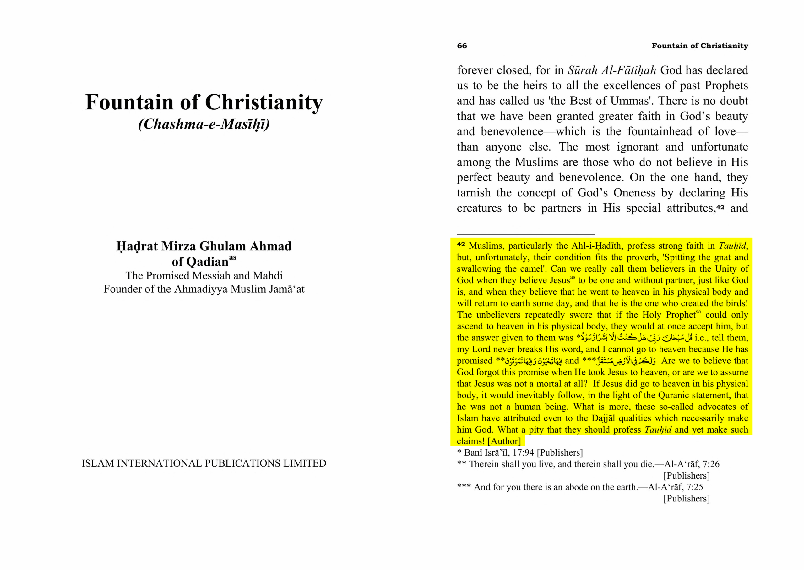 Muslims, particularly the Ahl-i-Hadith, profess strong faith in Tauhid, but, unfortunately, their condition fits the proverb, ‘Spitting the gnat and swallowing the camel’. Can we really call them believers in the Unity of God when they believe Jesus (as) to be one and without partner, just like God is, and when they believe that he went to heaven in his physical body and will return to earth some day, and that he is the one who created the birds! The unbelievers repeatedly swore that if the Holy Prophets could only ascend to heaven in his physical body, they would at once accept him, but the answer given to them was قُلْ سُبْحَانَ رَبِّي هَلْ كُنْتُ إِلَّا بَشَرًا رَسُولًا i.e., tell them, my Lord never breaks His word, and I cannot go to heaven because He has promised فِيْهَا تَحْيَوْنَ وَفِيْهَا تَمُوتُونَ and وَلَكُمْ فِي الْأَرْضِ مُسْتَقَرٌّ Are we to believe that God forgot this promise when He took Jesus to heaven, or are we to assume that Jesus was not a mortal at all? If Jesus did go to heaven in his physical body, it would inevitably follow, in the light of the Quranic statement, that he was not a human being. What is more, these so-called advocates of Islam have attributed even to the Dajjal qualities which necessarily make him God. What a pity that they should profess Tauhid and yet make such claims!
