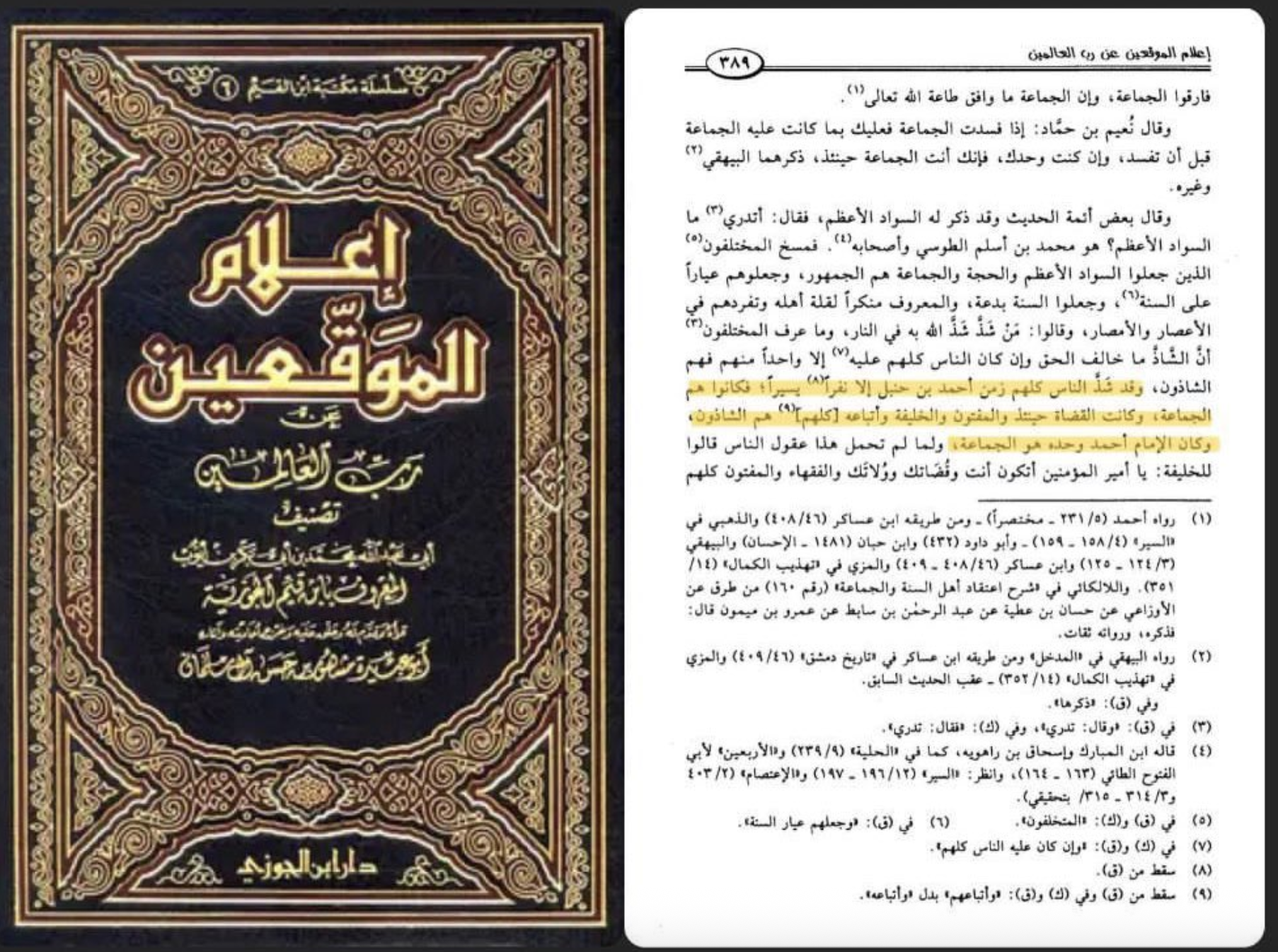 “All the people went astray during the time of Aḥmad b. Ḥanbal, except for a few individuals; thus, they were the Jamāʿah (the main body of the Muslims), while the judges, the Muftīs, the Khalīfah, and his followers were the ones who deviated and Imām Aḥmad alone was the Jamāʿah.”