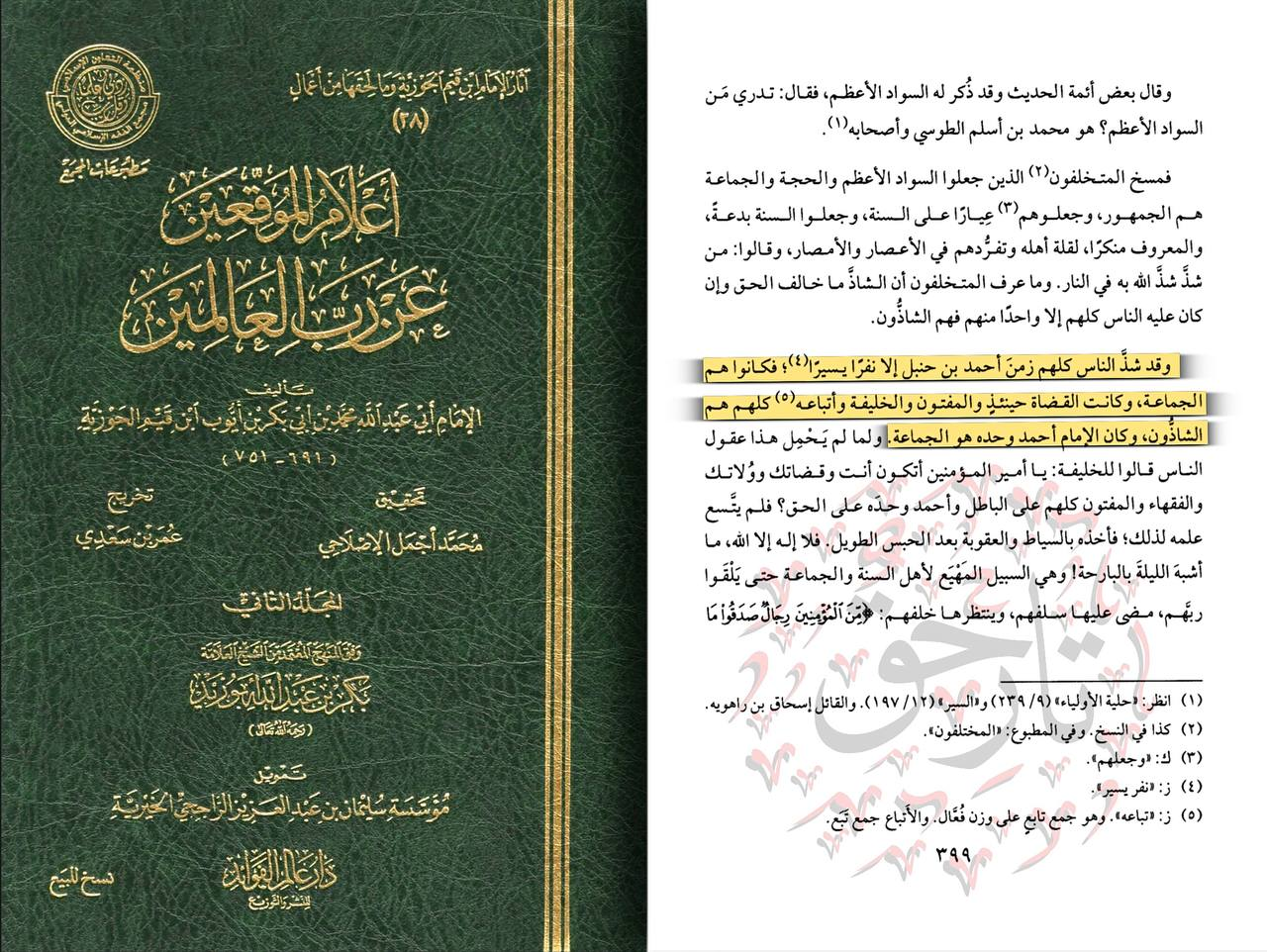 “All the people deviated during the time (Mihnat Khalaq al Qur’ãn) of Imam Ahmad Ibn Hanbal except for a small group, they were the Jammah, at that time the Judges, Muftis, the Caliph and his followers were all deviant and Imãm Ahmad alone was the Jamã’ah.”