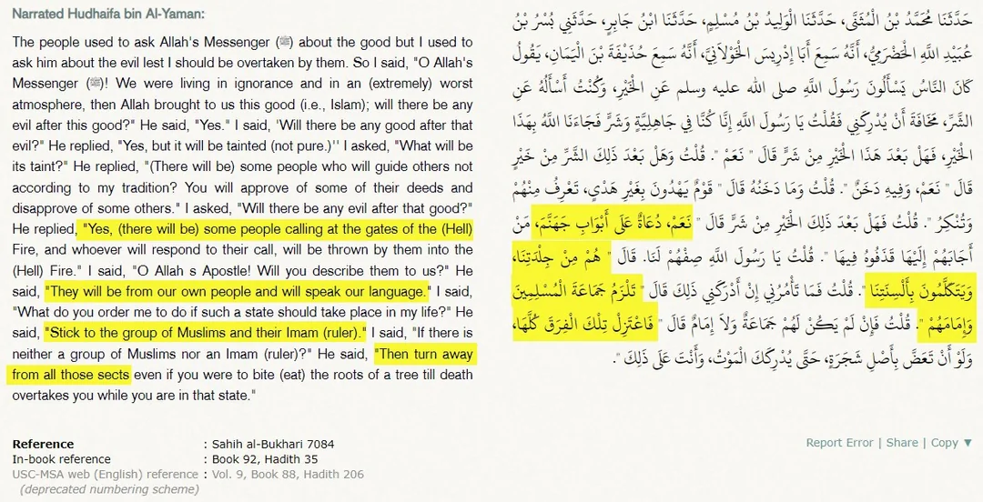 The people used to ask Allah’s Messenger (ﷺ) about the good but I used to ask him about the evil lest I should be overtaken by them. So I said, “O Allah’s Messenger (ﷺ)! We were living in ignorance and in an (extremely) worst atmosphere, then Allah brought to us this good (i.e., Islam); will there be any evil after this good?” He said, “Yes.” I said, ‘Will there be any good after that evil?” He replied, “Yes, but it will be tainted (not pure.)” I asked, “What will be its taint?” He replied, “(There will be) some people who will guide others not according to my tradition? You will approve of some of their deeds and disapprove of some others.” I asked, “Will there be any evil after that good?” He replied, “Yes, (there will be) some people calling at the gates of the (Hell) Fire, and whoever will respond to their call, will be thrown by them into the (Hell) Fire.” I said, “O Allah s Apostle! Will you describe them to us?” He said, “They will be from our own people and will speak our language.” I said, “What do you order me to do if such a state should take place in my life?” He said, “Stick to the group of Muslims and their Imam (ruler).” I said, “If there is neither a group of Muslims nor an Imam (ruler)?” He said, “Then turn away from all those sects even if you were to bite (eat) the roots of a tree till death overtakes you while you are in that state.”