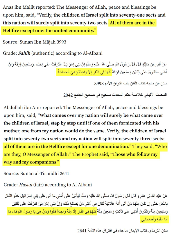 “The Children of Israel split into seventy-one sects, and my nation will split into seventy-two, all of which will be in Hell apart from one, which is the main body.”