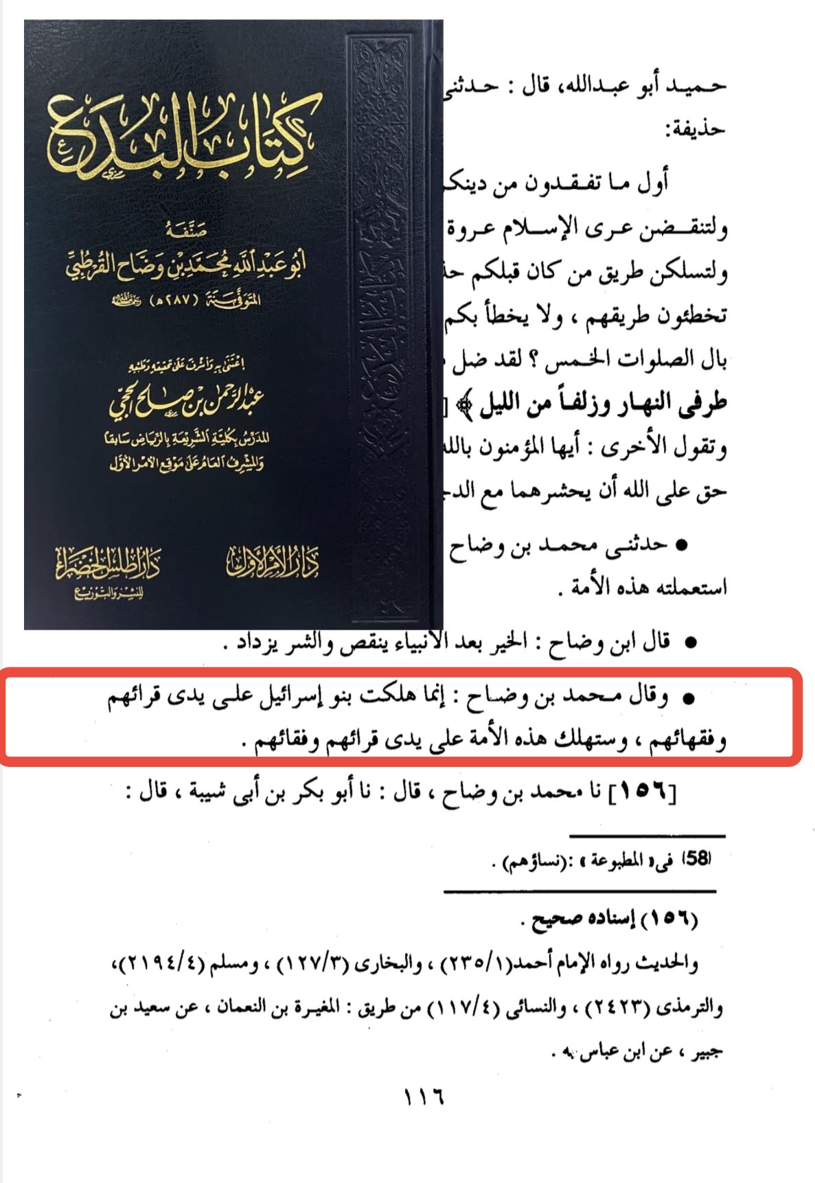 “Banu Isra’il were only destroyed at the hands of their reciters and scholars and this nation [muslim ummah] will likewise be destroyed at the hands of its reciters and scholars.”
