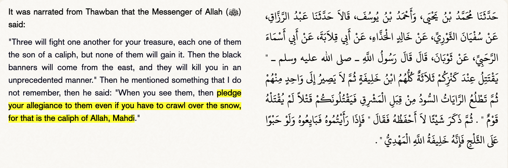 “[…] Then the black banners will come from the east […].” “When you see them, then pledge your allegiance to them even if you have to crawl over the snow, for that is the caliph of Allah, Mahdi.“